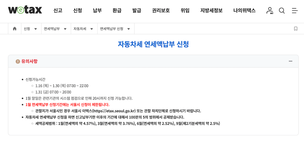 - 연납 신청: ‘자동차세 연납 신청’ 메뉴를 클릭하여 신청합니다.