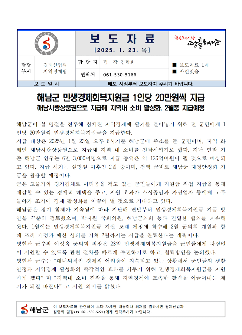 전남 해남군이 설 명절을 맞아 군민 생활 안정과 지역 경제 활성화를 위해 1인당 20만 원의 민생경제회복지원금을 지급한다고 밝혔습니다. 이번 지원금은 고물가와 경기 침체로 어려움을 겪고 있는 군민들에게 실질적인 도움을 제공하고, 지역 내 소비를 촉진하기 위해 마련되었습니다.